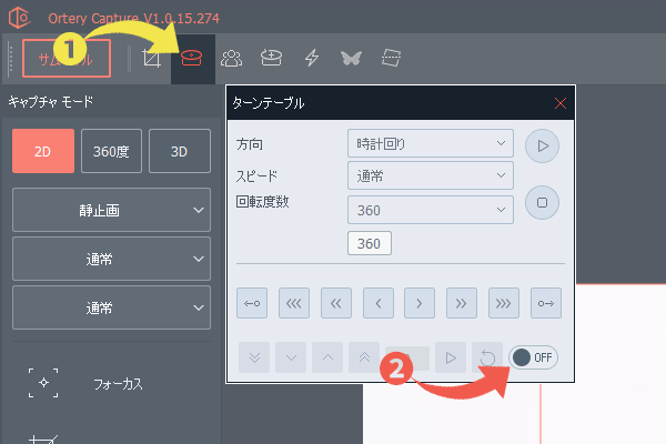 上部の「ターンテーブル」アイコンをクリックし、下部のON/OFFで空気の吸引を操作します。