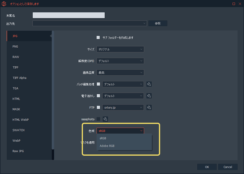 ホームよくあるご質問(FAQ)保存する画像の色空間を変更したい 保存する画像の色空間を変更したい 対象製品: 共通 こちらは2022年9月15日にリリースされた「Ortery Capture V1.0.18.297」以降に対応した機能です 設定 ファイル保存画面の「設定」画面を表示します 「色域」より、色空間の設定が可能です 関連記事 よくあるお問い合わせ一覧 カメラ複数台接続時の撮影カメラ切り替え方法 撮影した画像がボケる