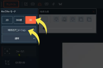 1. 撮影画面から「3D」、その下は「球状(または半球状)のアニメーション」を選択します