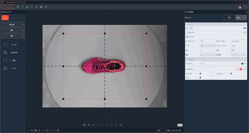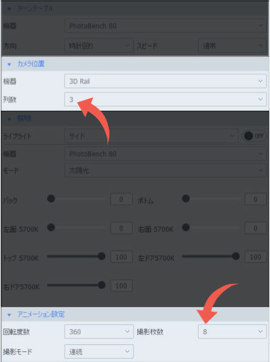 カメラがターンテーブルの中心を向くように調整します。俯瞰のカメラを基本に調整するのがおすすめです。