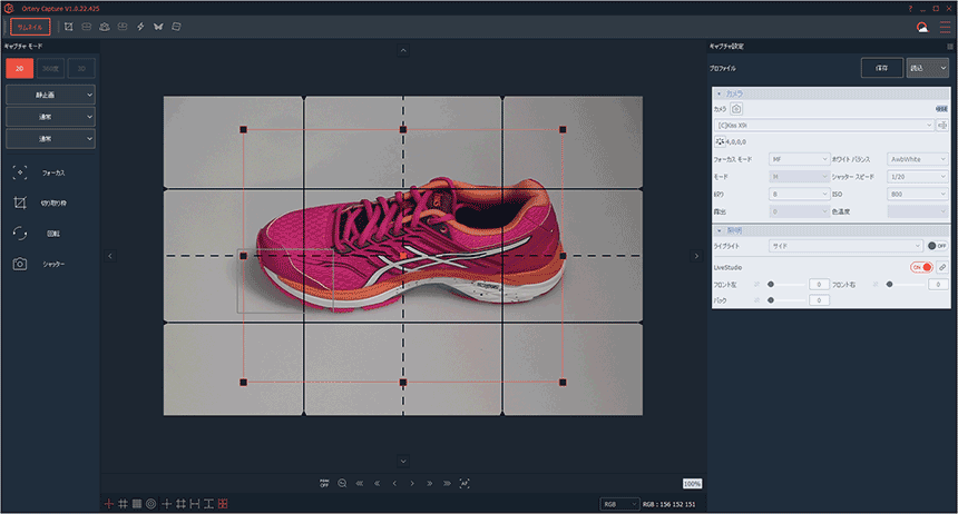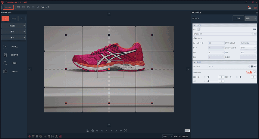 ソフトウェア画面のグリッド線を使って、どのカメラからも同じくらいの大きさで被写体が撮影できるように調整してください。