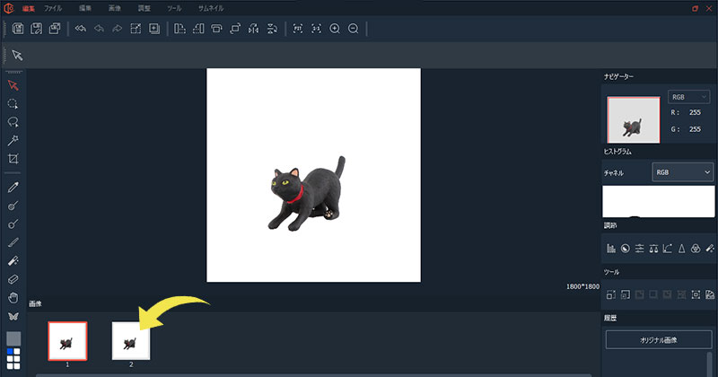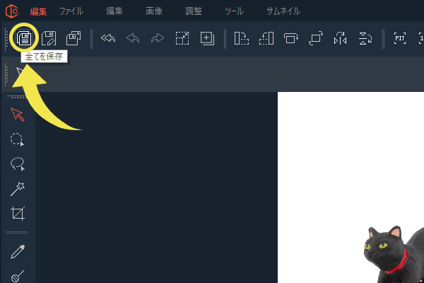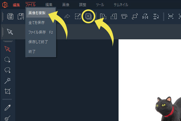 ホーム機能別画像編集撮影した画像を複製(コピー)する 撮影した画像を複製(コピー)する 対象製品: 共通 サムネイル画面で画像を選択し、「編集」をクリックします 編集画面の左上、ファイルより「画像の複製」もしくは画像複製アイコンをクリックします 画像が複製されたことを確認します 編集画面の左上、「全てを保存」アイコンをクリックして、編集画面を閉じます サムネイルに複製した画像が追加されます 関連記事 画像のアスペクト比や余白を調整する【マージンの追加】 リフレクションツールの使い方 パターンスタンプツールを使用する