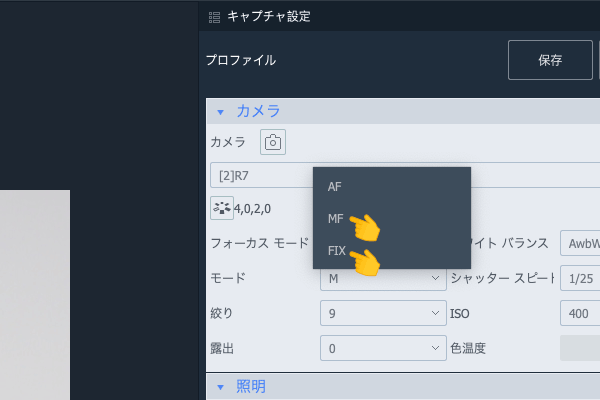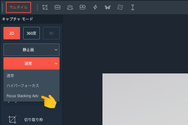 画面左上のキャプチャモード内から「Focus Stacking Adv」を選択します