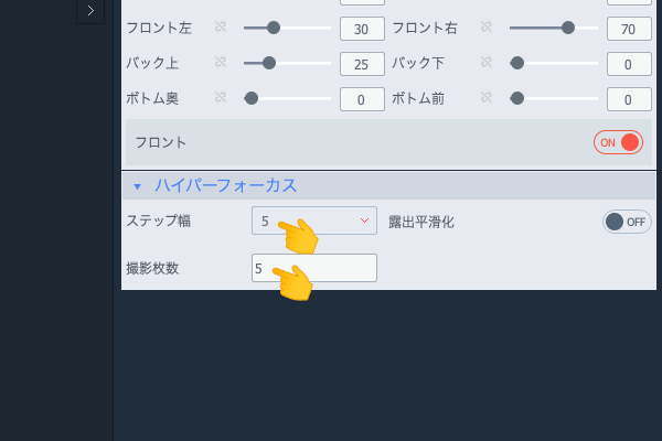 ステップ幅や撮影枚数の設定がわからない場合、何度か試し撮りしてピントが全体に合うか確認しながら調整してください