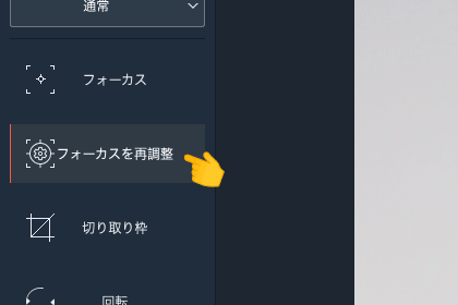 撮影画面にある黒い四角を被写体の一番手前に動かし、「フォーカスを再調整」ボタンを押してピントを合わせます