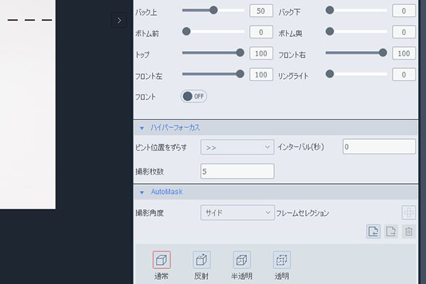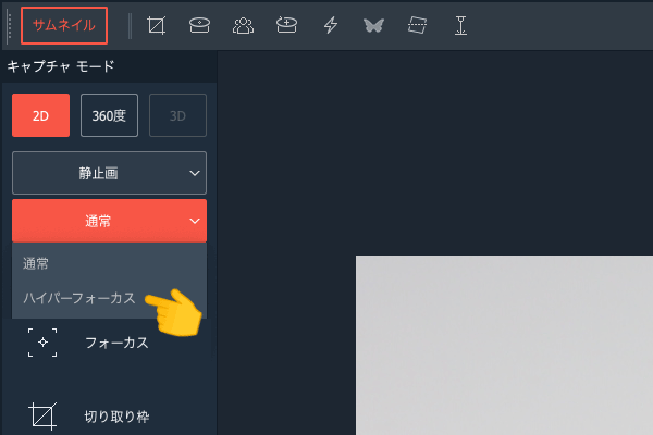 キャプチャモードを「静止画」「ハイパーフォーカス」と選択。「AutoMask」と併用も可能です。