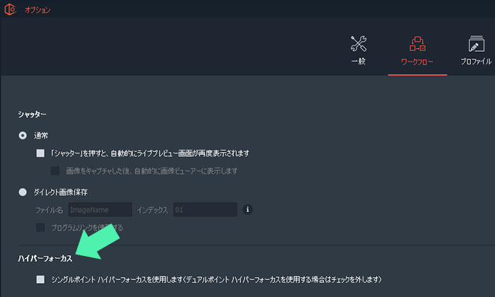 ソフトウェア画面右上のオプション内、「ワークフロー」よりハイパーフォーカスの撮影方法が選択できます