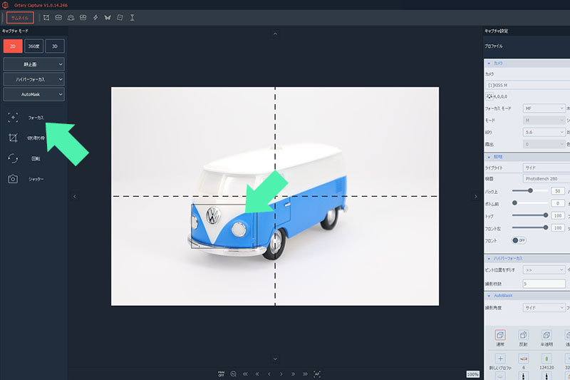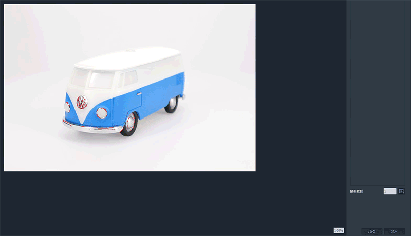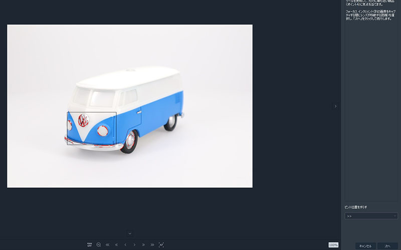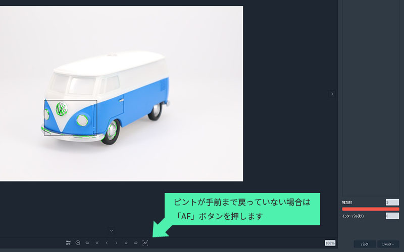 画面右下、「撮影枚数」右のボタンを押すと、ピントが奥へ移動します。被写体の最後方にピントが合うまで、枚数を増やしていきます。ピントが被写体の最後方に合ってきたら、「次へ」を押します