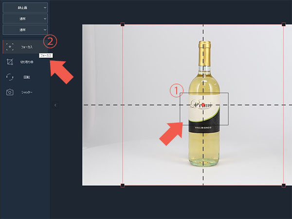 - 黒い枠を被写体に合わせて、「フォーカス」ボタンを押します