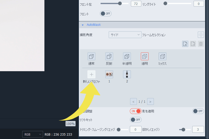 - 撮影画面「AutoMask」メニュー内の「新しいプロファイル」をクリック、もしくは「手動調整」をONにして撮影します。