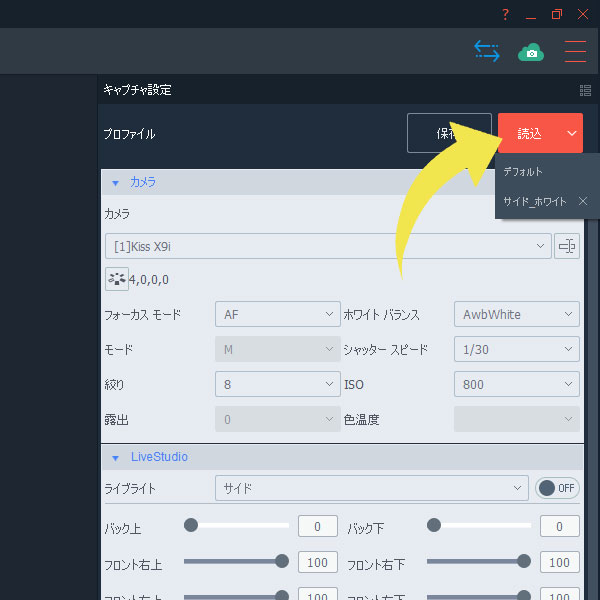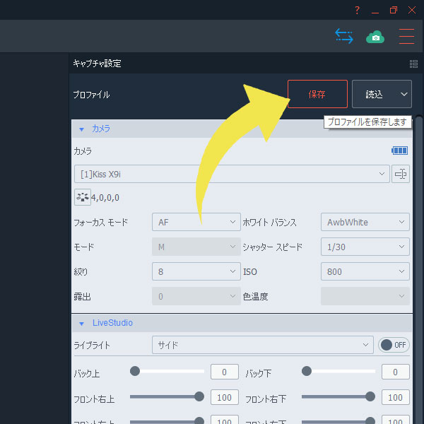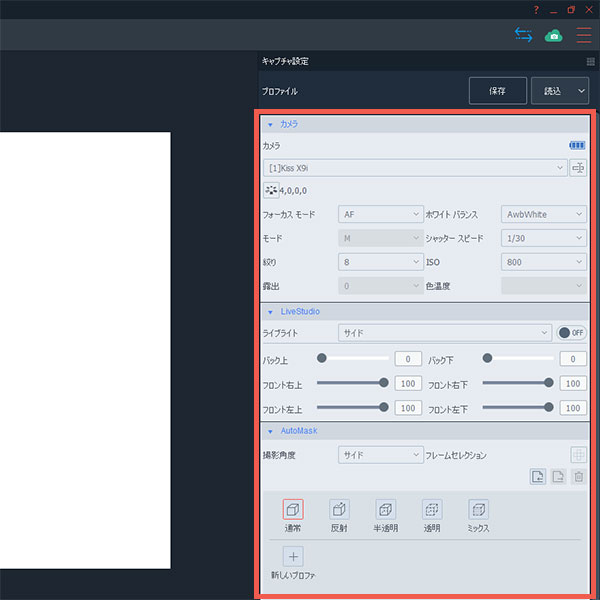 - 画面右キャプチャ設定の「カメラ」「照明」の数値を設定