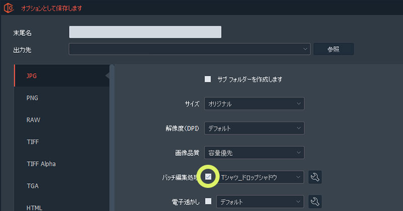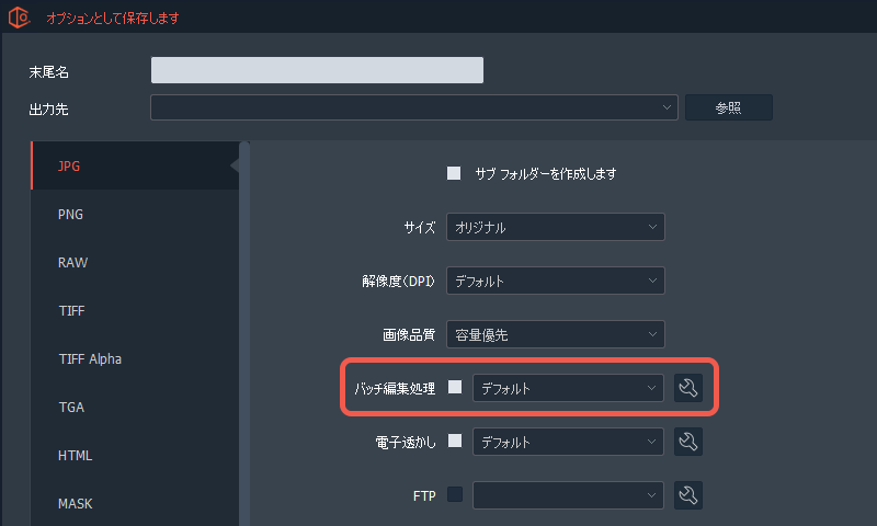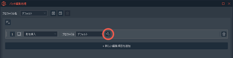 - 「バッチ編集処理」欄の右の設定ボタン(工具アイコン)をクリックします