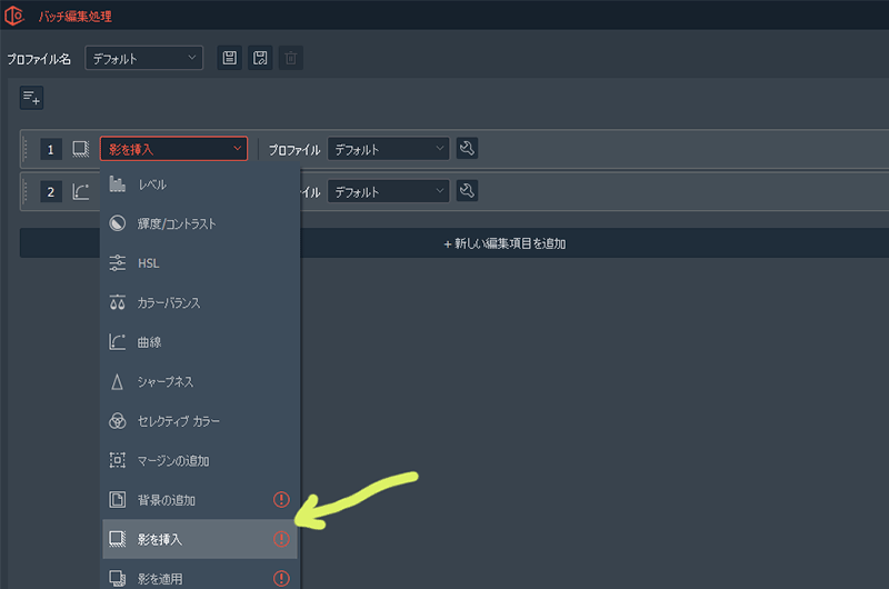- 「影を挿入」列の設定ボタン(工具アイコン)をクリックします