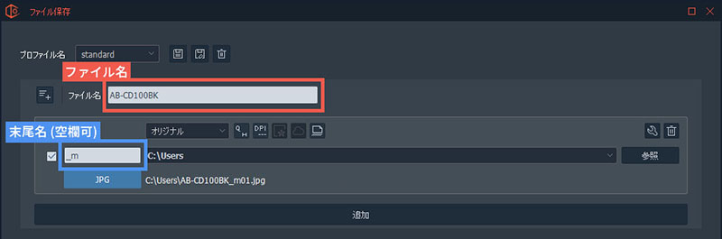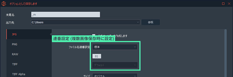 ■ファイル名連番設定任意 複数のファイルを同時に保存するときに追加されます。「ファイル名」「末尾名」の後ろに付きます。