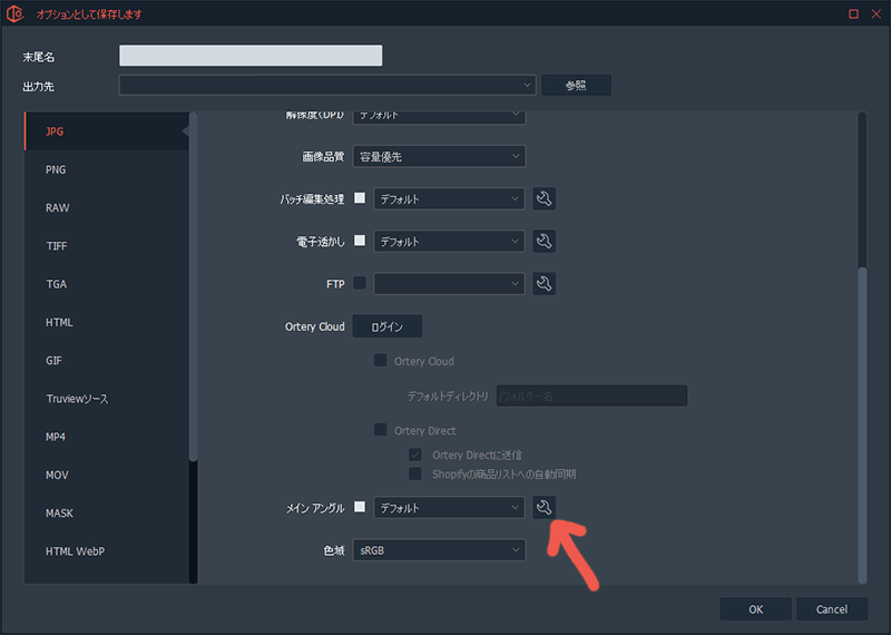 保存画面の設定内「メインアングル」欄の工具ボタンをクリックします。