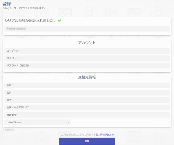 導入製品のシリアル番号を入力後、アカウント情報を設定して「登録」をクリックします
