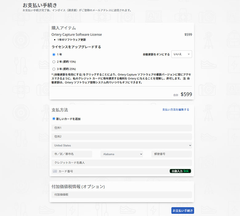 ライセンスの購入は、Ortery Technologies, Inc.(米国)とのお取引になり、クレジットカード決済のみ対応となっております。お支払い手続き完了後、インボイスがご登録のメールアドレスに送信されます。