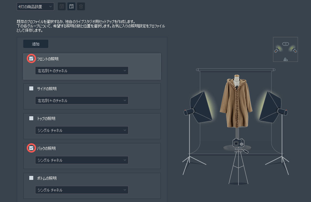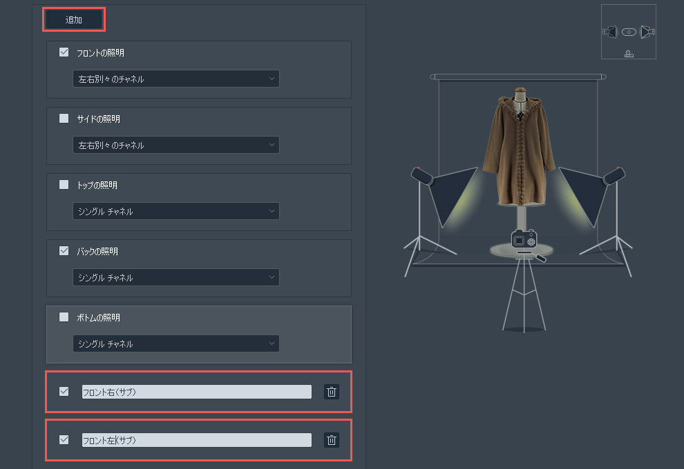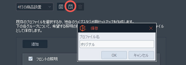 (例として、フロントとバックにチェックを入れています) - 「追加」を押すと、自由に名前を付けることができるライト設定が追加されます