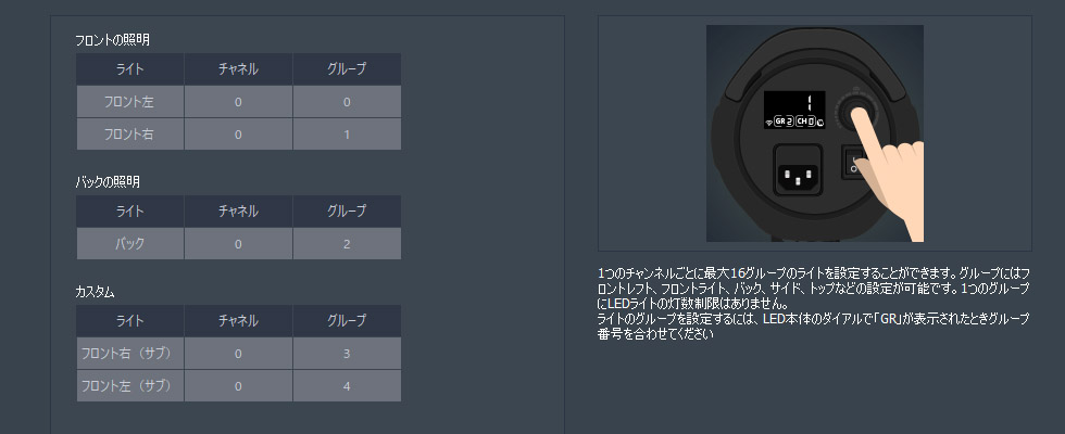- 希望のライト設置場所にチェックを入れ、シングルチャネル、もしくは別々のチャネルかを選択します