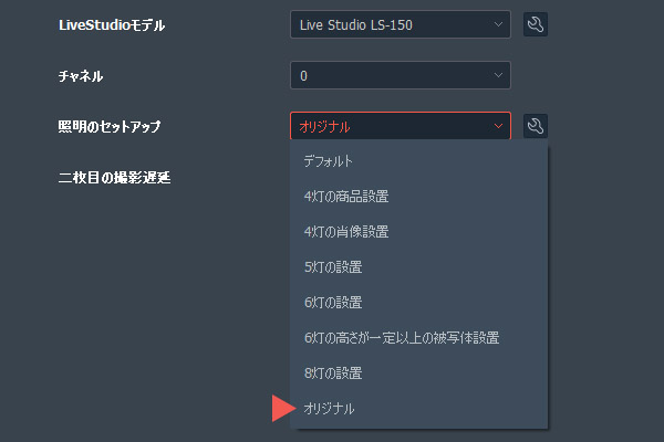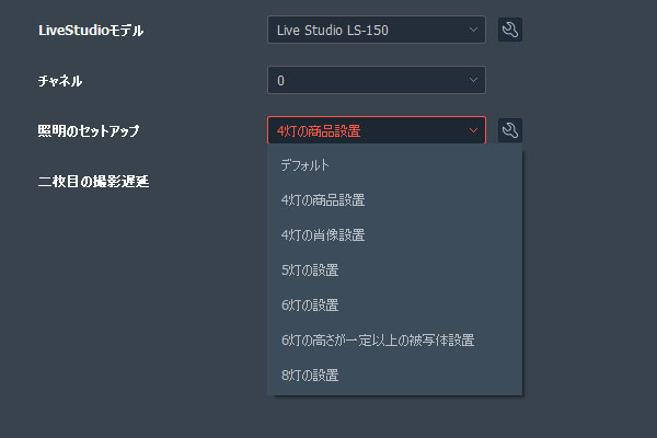 - メニューの戻ったあと、「照明のセットアップ」のプルダウンから、作成したテンプレートを指定します