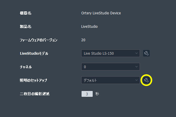 - 「照明のセットアップ」の右の設定ボタン(工具アイコン)をクリックします