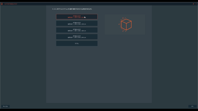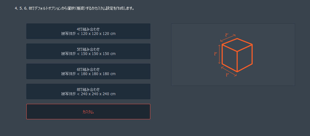 - デフォルトオプション、もしくはカスタムから照明の設定を選択し、右下の「次へ」に進みます