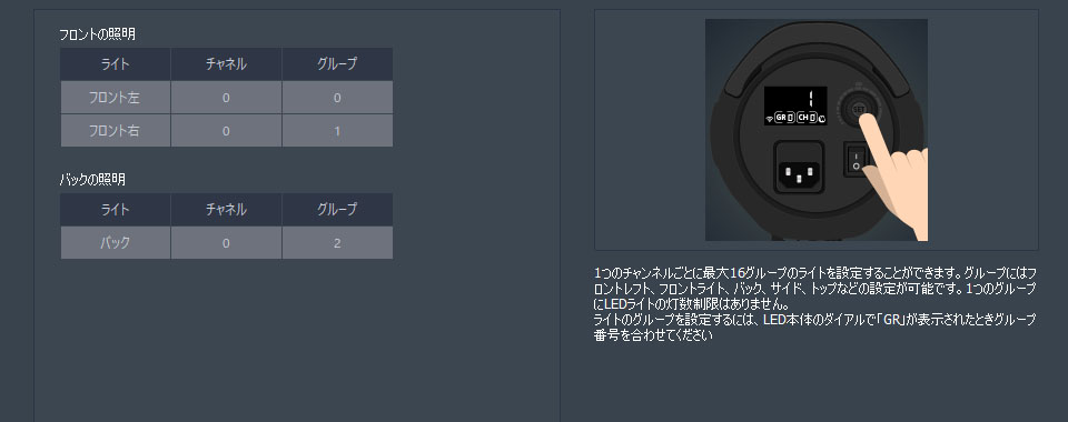 - ライトのチャネル/グループ番号を、それぞれライトを操作してセットし、「終了」をクリックします
